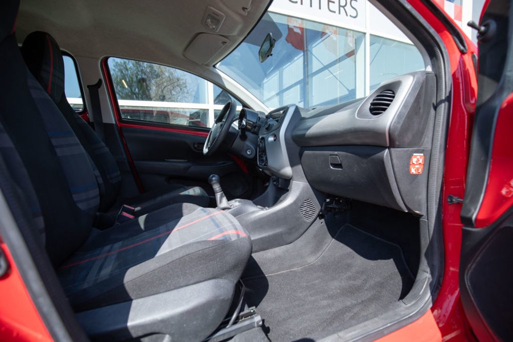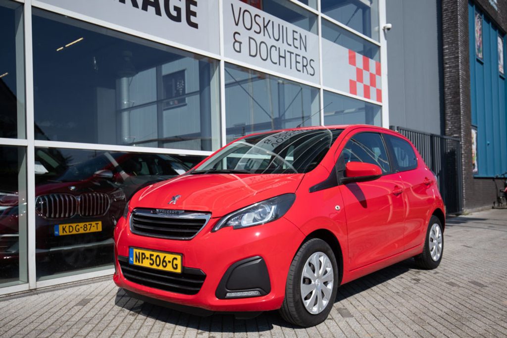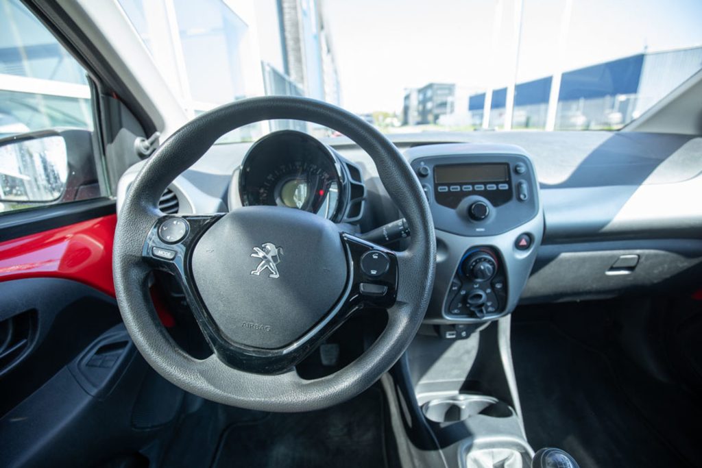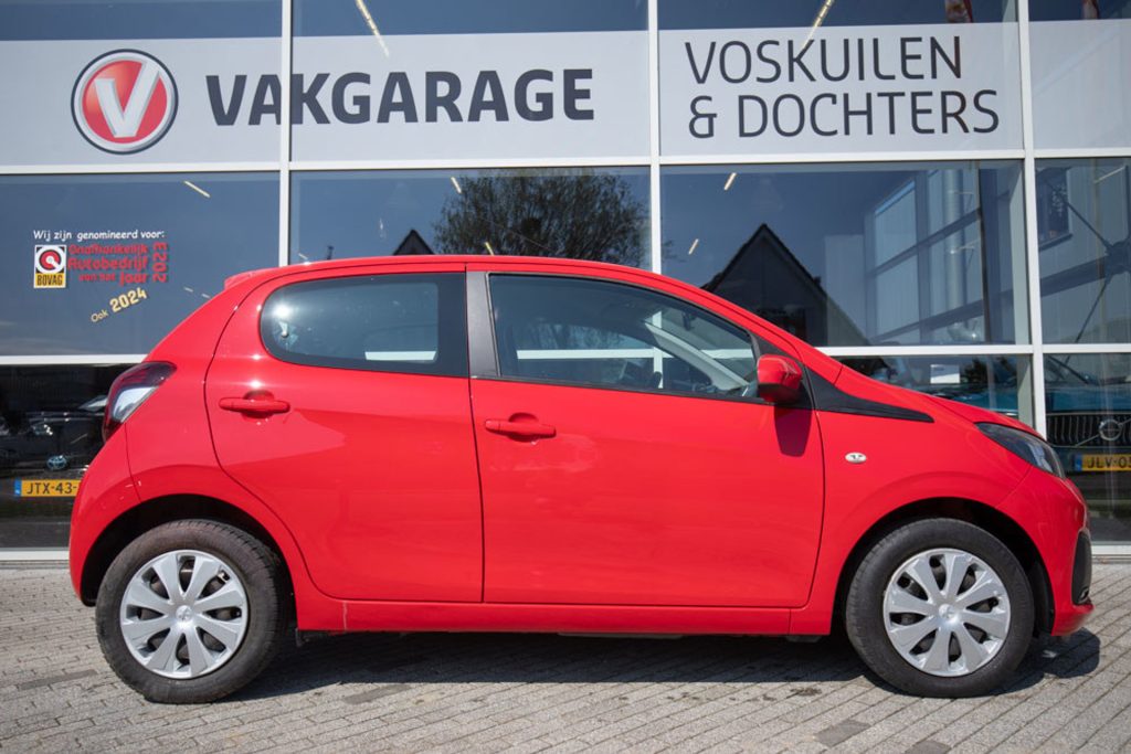 Peugeot 108 in red, featuring 5 doors, air conditioning, and Bluetooth. This compact and fuel-efficient city car is ideal for daily use and offers a surprising amount of space and comfort. The car has always been properly maintained by a dealer, and the service booklet contains all the stamps, underscoring its reliability and meticulous history. Both mechanically and cosmetically, the car is in good condition, making it ready for many carefree miles.